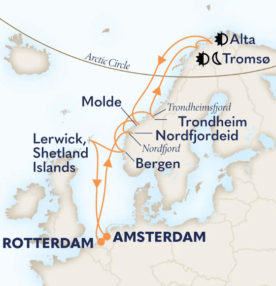 Kupers Reisinfo biedt in samenwerking met Holland America Line een exclusieve Limburgs begeleide Arctische cruise naar het Noorderlicht aan met vertrek vanuit Rotterdam. Steek de poolcirkel over, bezoek Tromsø en overnacht in Alta, de “stad van het noorderlicht”. Verken de spectaculaire fjorden en afgelegen havens van Noorwegen.